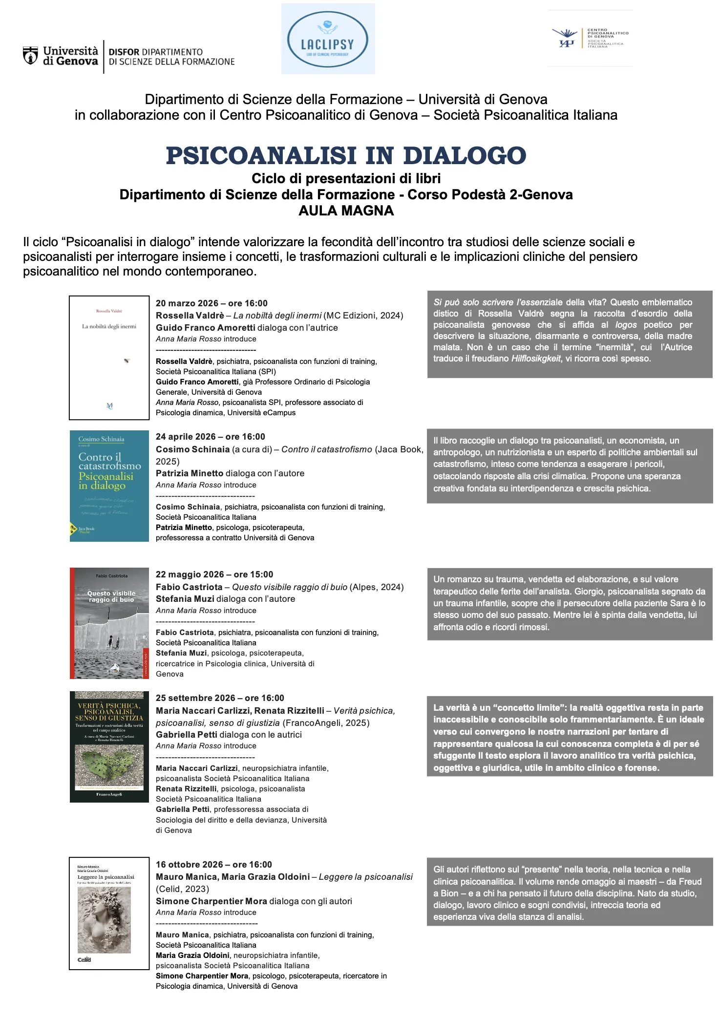 Il ciclo “Psicoanalisi in dialogo” intende valorizzare la fecondità dell’incontro tra studiosi delle scienze sociali e psicoanalisti per interrogare insieme i concetti, le trasformazioni culturali e le implicazioni cliniche del pensiero psicoanalitico nel mondo contemporaneo.